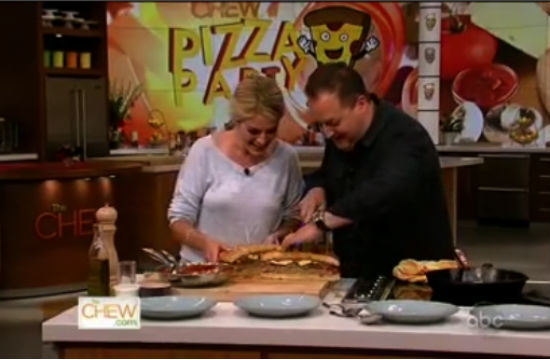 In spite of a lack of opportunity to defend his honor, Josh burger-ified the festivities on the special pizza-themed episode of The Chew (in honor of National Cheese Pizza Day, which is today) by making an enormous pizza burger that feeds “two to eight people” according to him. (But according to Daphne Oz, it’s eight healthy servings.)
