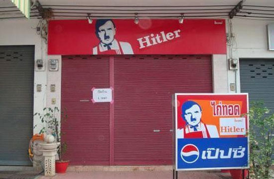 Very bizarre Hitler Fried Chicken shop in Thailand. I kid you not. Complete with pic of Hitler in bow tie http://t.co/9OS1FgfUCx