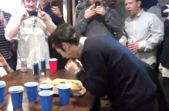 Other guys shout out unintelligible, but probably equally offensive things in general mockery and derision, until the end where they clap and pass him a beer to chug. The whole thing has the same uncomfortable vibe as watching video footage of a really terrible frat hazing. It just makes us feel dark and sad inside. We hope Kobes was at least welcomed into the bro flock after his performance and not pointed to and laughed at all night.