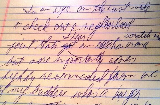 Twitter: Josh Ozersky snapped a photo of Guy Fieri’s intro copy, which he apparently writes himself on the spot, while he was filming the Astoria episode of Triple D. Guy Fieri’s penmanship is everything you’d expect it to be.