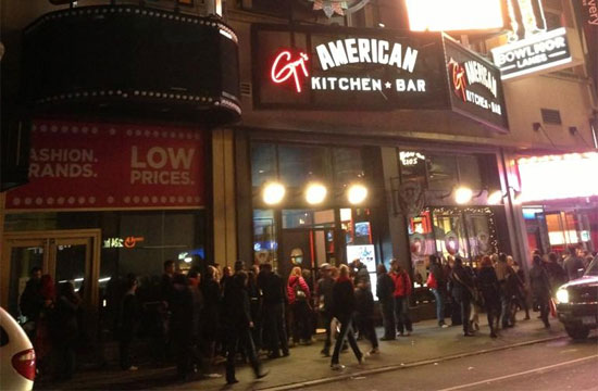 Twitter: Someone, quick, capture Guy Fieri and subject him to scientific experiments in a shadowy government lair! Blogger Adam Roberts snapped this photo of the oddly long line outside of Guy’s American Kitchen and Bar, showing that absolutely nothing has happened since The Review. We could create a vaccine for cancer out of Guy Fieri.