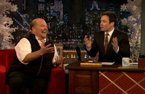 Mario Batali stopped by Late Night with Jimmy Fallon last night, just before his family was scheduled to jet off to Michigan for the holidays. Amidst showing photos of the Batalis’ gorgeous Michigan lake house (East Coasters be jealous: they’ve got 14 inches of snow) and the pine tree they’re going to chop down this year, Mario and Jimmy fell upon the subject of sports.