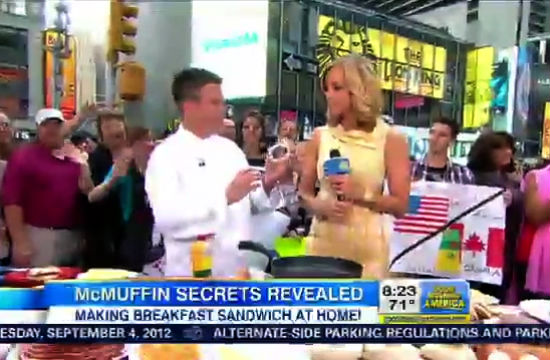 As part of an ever-more puzzling PR campaign to pitch McDonald’s as a healthy fast food option, its “executive chef” Daniel Coudreau stopped by Good Morning America today to demo for all of us how we can make the famed Egg McMuffin at home on this, the Egg McMuffin/McDonald’s Breakfast Menu’s 40th Birthday.