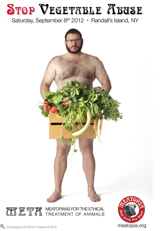 We admire a man who admits his passion for meat. We admire hosting a reverent festival on a tiny island between Manhattan and Queens in honor of meat consumption everywhere. Does that mean we have to admire Meatopia founder Josh Ozersky spoofing nude celebrity PETA ads with his META (Meatopians for Ethical Treatment of Animals) campaign? Because it looks like this:
