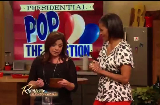 Rachael Ray celebrated her season premiere of The Rachael Ray Show today, and, to kick off both her first season in a new studio and shooting in HD for the first time, she brought on First Lady Michelle Obama to cook and chat. After serving up some “healthy” broccoli cheddar turkey burgers with Lady O’s signature avocado ranch dressing, Michelle and Rachael played a round of Mom-in-Chief-themed Pop the Question along with a foodie version of Would You Rather. A few highlights: