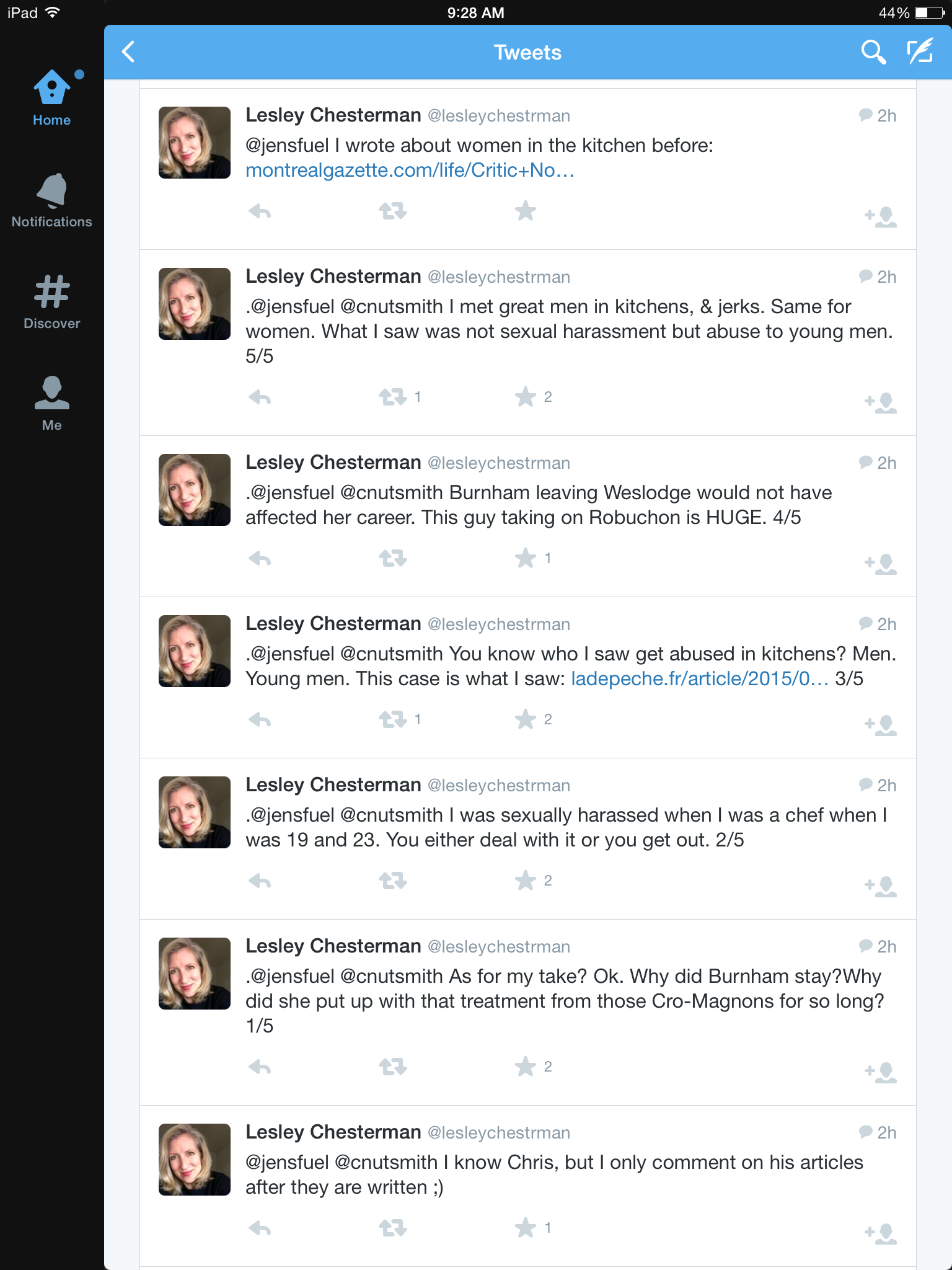 Montreal Gazette restaurant critic Lesley Chesterman took to Facebook and Twitter, offering a counterpoint to the industry praise former Toronto pastry chef Kate Burnham received after going public with the year and-a-half of physical and psychological sexual abuse she claims to have suffered by three chefs at Weslodge restaurant.
