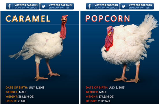 Meet Caramel and Popcorn, the two latest turkeys to be granted a slow and agonizing death from obesity-related causes by the White House. This torturous existence was granted in the form of mercy by Barack Obama, as part of his yearly Thanksgiving turkey pardon, and while the two turkeys will live the rest of their days on a lush Virginia farm, it’s basically the turkey equivalent of hospice care.