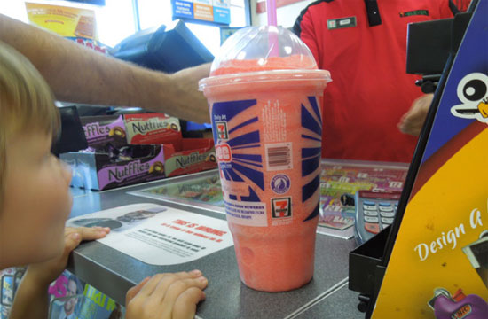 Here is a photo of a 32 oz. Slurpee, and an object for comparison (a baby’s head):