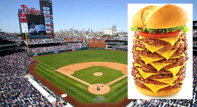 When your baseball team is, well, not so good, how do you get fans through the gates? Make them fat. They may not fit through the gate, though, on the way out of the Phillies’ Citizens Bank Park after catching the 9-patty triple-triple. Yes, nine patties. Nine slices of cheese tucked between the token lettuce and tomato.