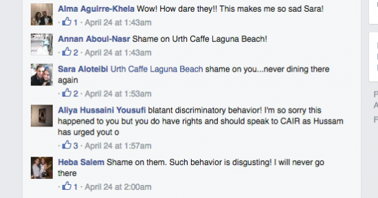 If you live in Los Angeles or have friends who do, you undoubtedly have been to or have heard about Urth Caffé. It’s the coffee place with sandwiches and salads that’s super L.A. and you go there when you want to feel like a true L.A.-er. According to Sara Farsakh, who posted her account of the incident on Facebook, “what began as a night out with some friends ended as a painful and embarrassing reminder of what it is like to be visibly Muslim—even in liberal California.”