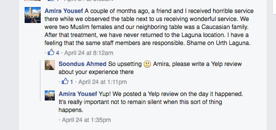 He is offering her a meal on the house, but damage has already been done on both sides. The Facebook post has had such an impact that Yelp has blocked people from reviewing the establishment. Facebook commenters have expressed outrage; many posters say they’ll never go back to Urth Caffé.