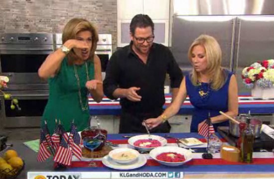 What is the obsession with red, white, and blue foods as a mark of culinary patriotism? Wouldn’t it be more patriotic to buy local than to dye your risotto red? But Scott Conant graciously performed his civic celebrity chef duty and delivered the requisite colored foods to Kathy Lee Gifford and Hoda Kotb on The Today Show this morning.