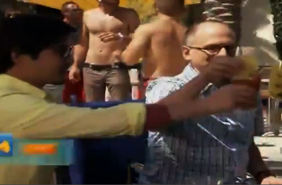 And by “the ball,” we mean a drunken poolside brunch hosted by former Playmate Holly Madison. So, as you can imagine, it was classy as all get out. Throw in buff Playboy-grade eye candy, and all of a sudden the editor-in-chief of Saveur Magazine is in a ‘shup contest with Guy Fieri some pretty boy. As Bravo’s convenient pop-up blurb informed us, James has a “troubled relationship” with push-ups, but “a little manly competition” inspired him to press out a respectable two to the muscle man’s 40. And by “a little manly competition,” we think James means “alcohol.” Just a guess.