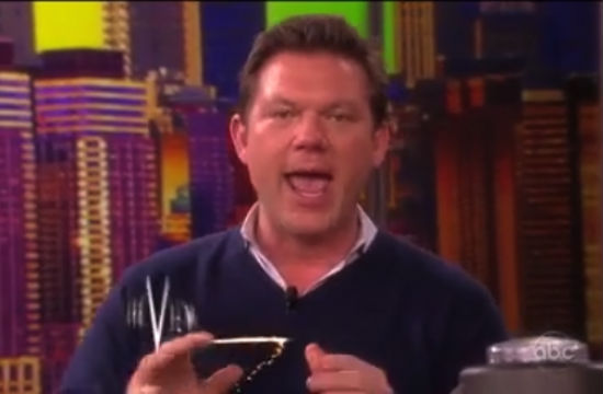 Former boyband member Tyler Florence managed to avoid disaster on The View during the show’s most panic-inducing segment, Cooking Sherri, but he did drop some church on those who complain about the expense of buying organic (or just produce in general). Cooking Sherri involves celebrity chefs teaching host Sherri Shepherd, who’s in the middle of a diabetes makeover à la Paula Deen, how to cook healthful foods. Personally, we’d live in mortal fear of being held responsible for Sherri chopping off her hand after seeing the way she wields a knife in the segment below. Side note: she also neglects to take the safety tip off her knife, thinking it was just “part of the decoration.”