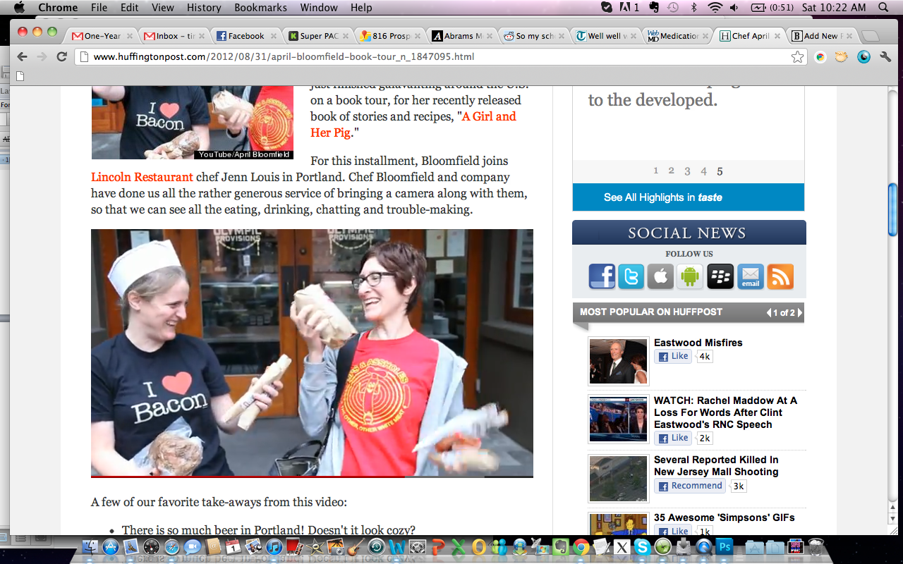 April Bloomfield has wrapped up her nationwide book tour promoting her memoir A Girl And Her Pig, meaning that she is no longer coming to a city near you, to cook with a chef in a city near you. But there is video of those fond memories, as well as things that one could not have possibly seen on the tour.