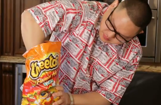 There is a big ass McRib sammich replete with bacon strips and more bacon strips. There is a bag of Flamin’ Hot Cheetos that Huang punches with his fists. There are all the things in the world that make Epic Meal Time special to us, like an adorably obese child covered in barbecue sauce. And yet…sigh. It’s probably because Huang was not made to eat his monster.