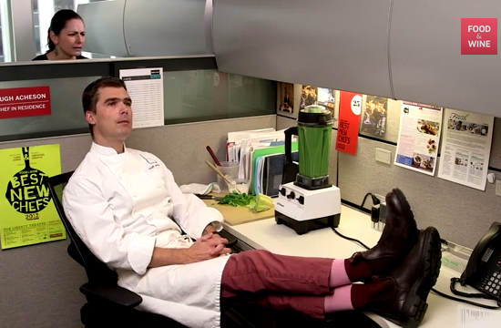 As part of their upcoming redesign, Food and Wine made this video about their “Chefs-in-Residence” feature, in which famous chefs contribute editorial content to the renowned magazine. For a brief moment in time, they took that concept literally, and/or decided to show David Chang, Mario Batali, Eric Ripert, Hugh Acheson, and Grant Achatz the amazing cubicle life they gave up in order to become chefs.
