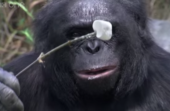 Well, really, it’s a Bonobo ape, which are notoriously intelligent — but we ain’t never seen a primate manage to build a fire and roast marshmallows on its own, without help from a trainer. (They can even get the marshmallows suitably toasted, which, what?)