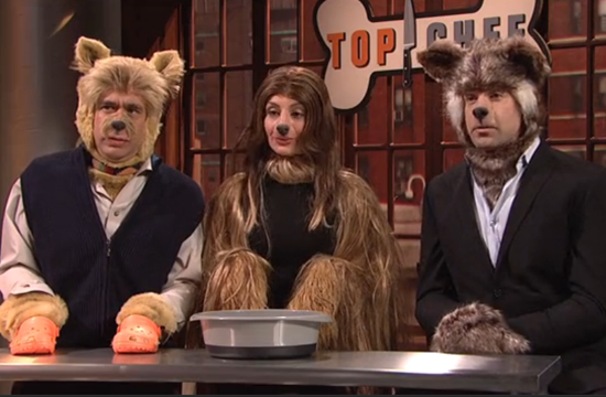 It finally happened, guys: after ten freaking seasons, Top Chef got sent up by Saturday Night Live using dogs and puns. And the results in Top Dog Chef has so many familiar moments to Top Chef fans, like “Padma Leash Me’s” sexy monotone, “Mario Bark-tali’s” be-Croc’d paws, and the usage of roulades of dog vomit. (Also a bonus: the beautiful, completely perfect host Jennifer Lawrence proudly talking about urinating on food, because hey, she’s a dog.)