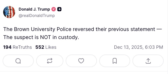 The president, a few minutes later, posted Brown University police “reversed their previous statement — The suspect is NOT in custody.”
