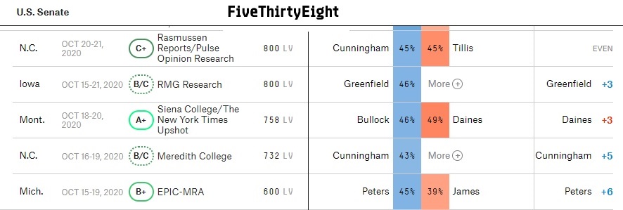 RCP’s forecast now shows Democrats with a shot at 54 seats, while FiveThirtyEight has them with a chance at landing on a 55-45 majority — unchanged since our last update. New Senate polls out Friday show Democratic candidates leading or tied in North Carolina, Iowa, and Michigan, while the Montana Senate race shows a 3-point advantage for GOP Sen. Steve Daines.