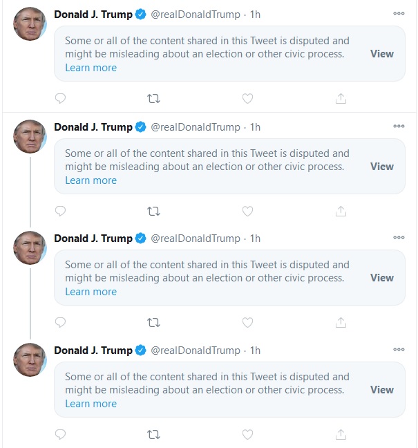 In fairly short order, Twitter hid the tweets with a message that said “Some or all of the content shared in this Tweet is disputed and might be misleading about an election or other civic process.”
