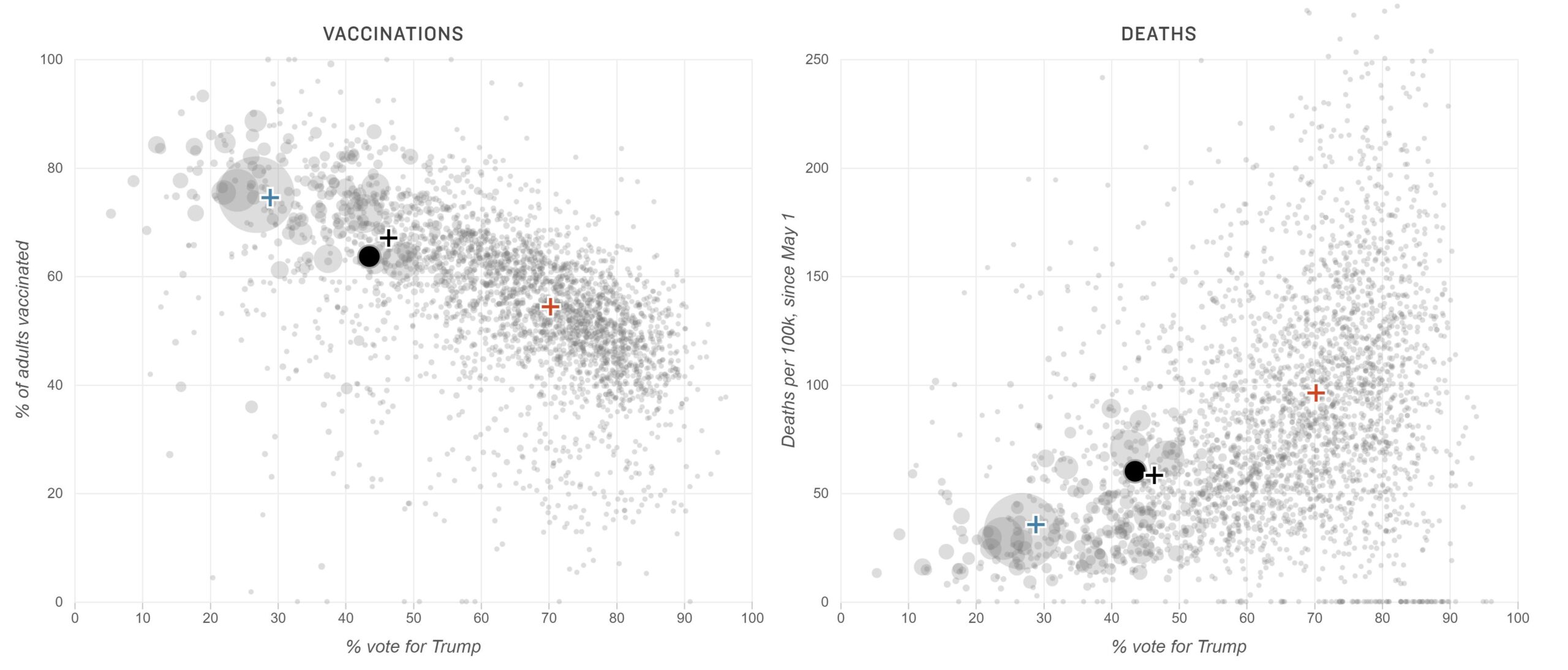 NPR has an interactive graph plotting county vaccination and death rates while highlighting both the national average and that county’s political leaning in 2020.