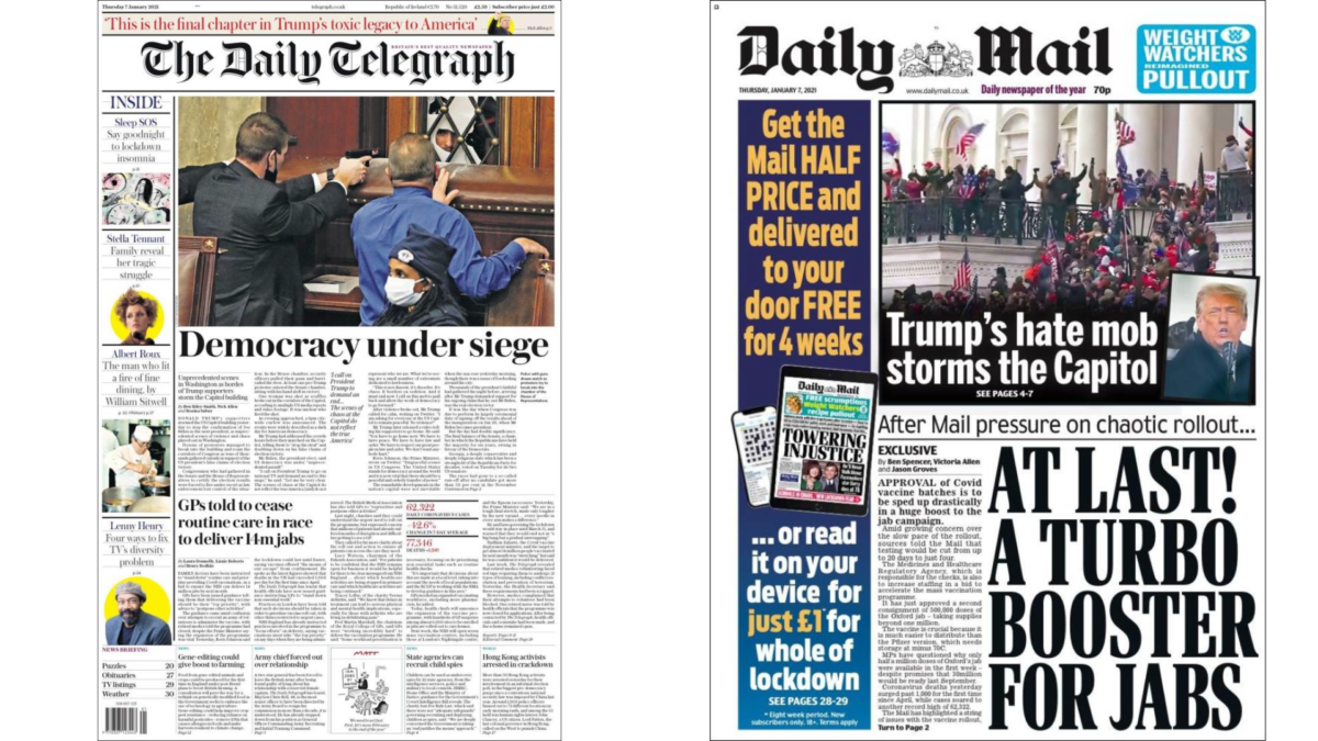 The attack was front page news in papers across the U.K., with headlines blasting the “Assault on Democracy” by the “Trump Hate Mob” and declaring “Anarchy” in their former colonies.
