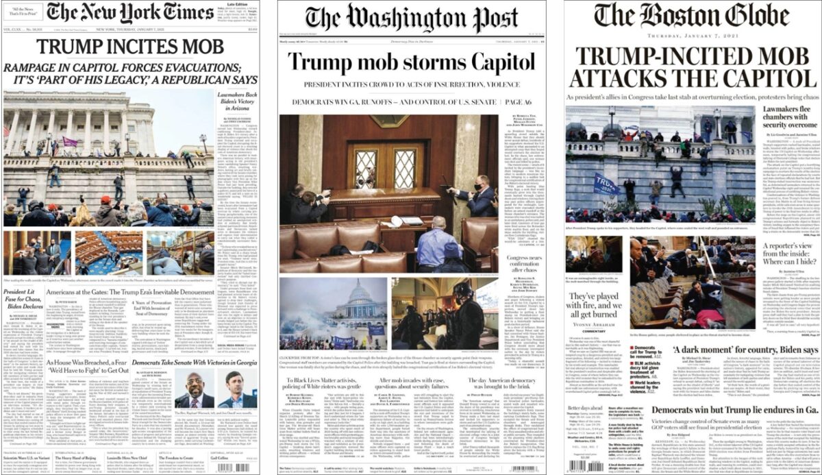 The attack on the U.S. Capitol by a mob of President Donald Trump’s supporters has sent shockwaves throughout the nation and the world, and newspaper front pages tell the story of how that news is being portrayed.