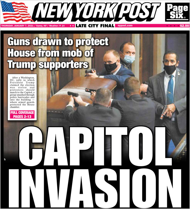 The New York Post, considered the gold standard for outrageous front pages, featured a harrowing photo of armed officers with guns drawn, and the banner “CAPITOL INVASION”.