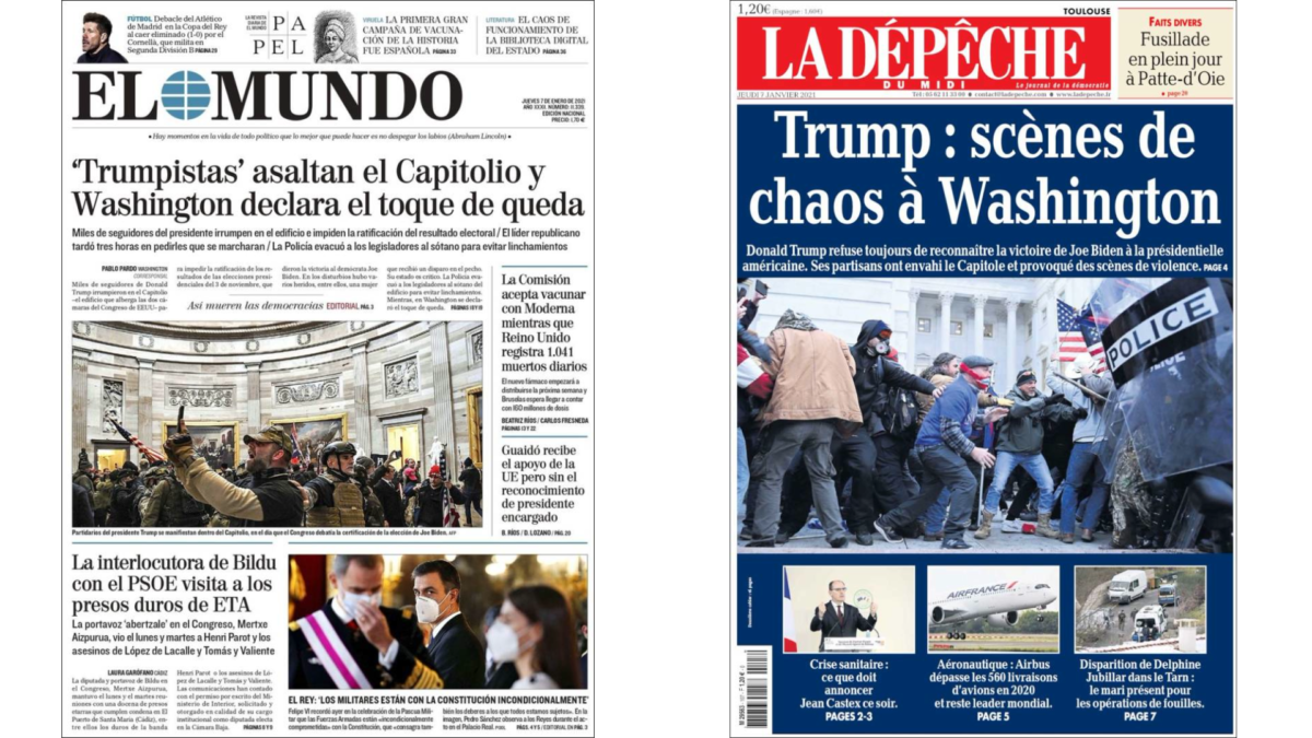 Trump didn’t go with them after all, but was there in spirit and flag as thousands occupied and ransacked the building and attacked police. Here’s how newspaper front pages in the U.S. and around the world told the story.