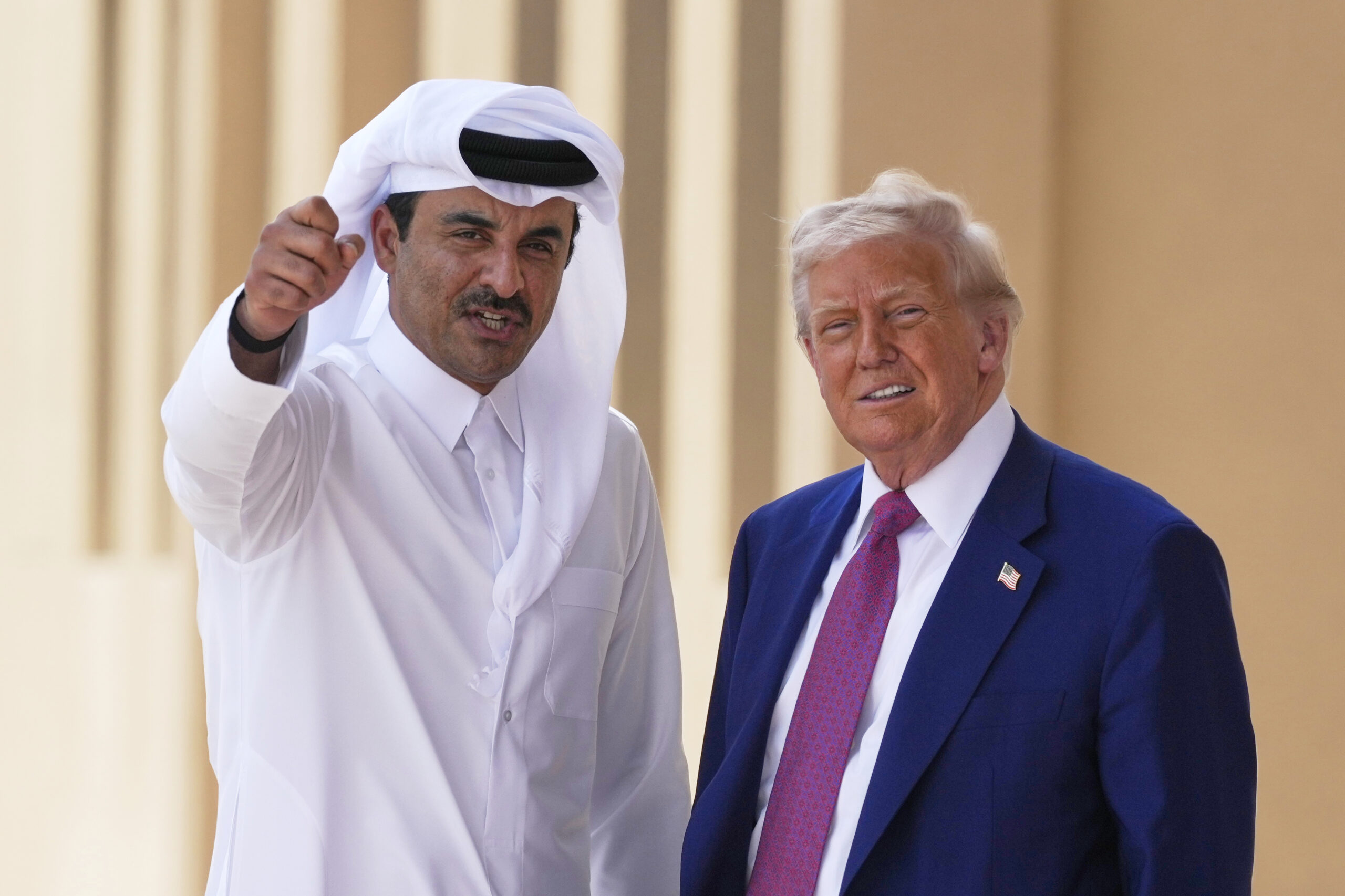 Qatar’s Emir Sheikh Tamim bin Hamad Al Thani gestures next to President Donald Trump at Al Udeid Air Base, Thursday, May 15, 2025, in Doha, Qatar. (AP Photo/Alex Brandon)