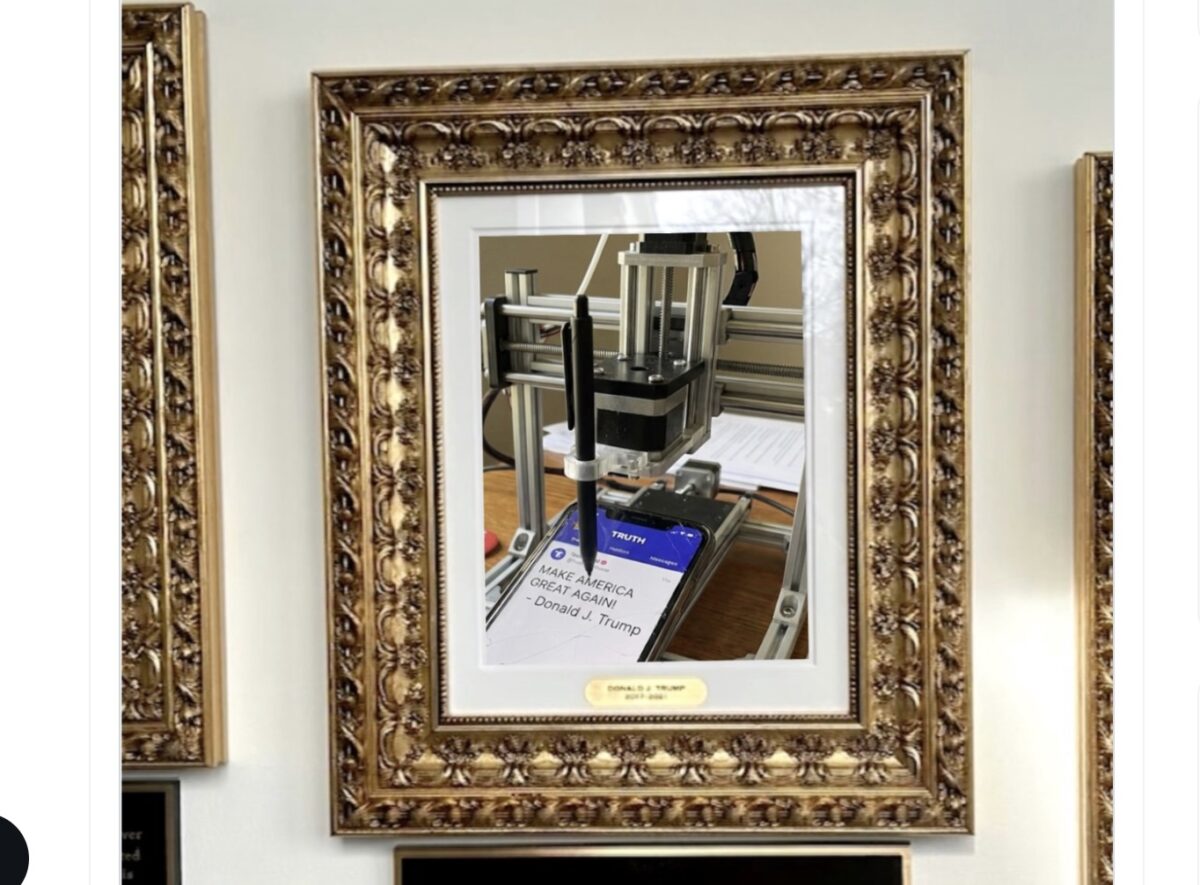The image featured a gilded frame like those that appear on Trump’s “Presidential Walk of Fame,” where Trump hung an image of an autopen in lieu of former President Joe Biden’s portrait.