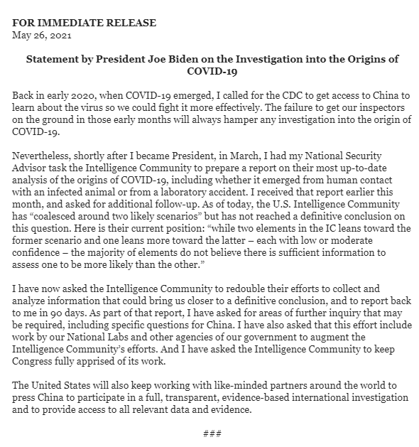 “I have now asked the intelligence community to redouble their efforts to collect and analyze information that could bring us closer to a definitive conclusion, and to report back to me in 90 days” Biden said. He additionally faulted China for refusing to let inspectors “on the ground” in the early months of the pandemic, and said he asked the intelligence community to come up with “specific questions for China.”