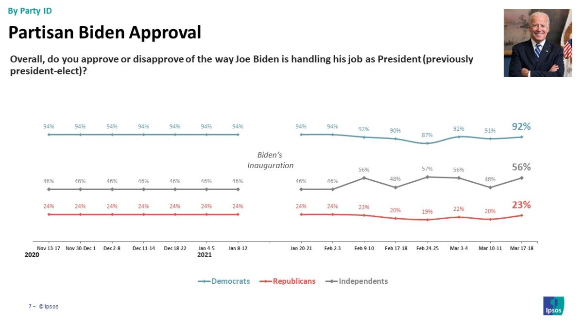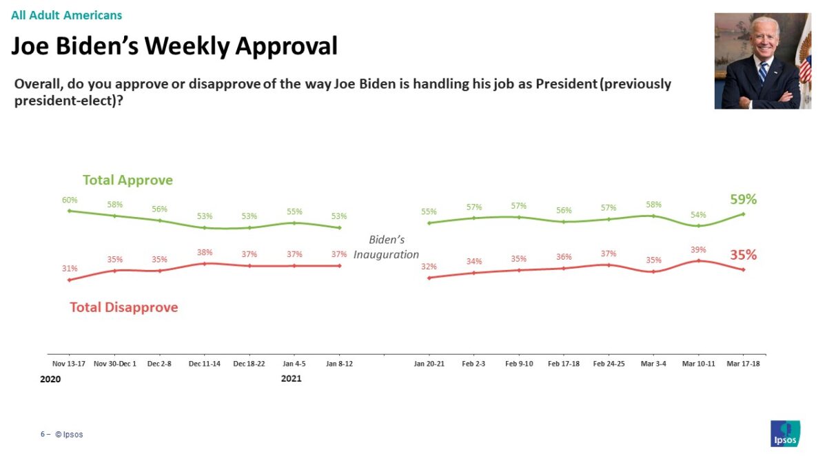 In last week’s Reuters/Ipsos poll, 54 percent of Americans approved of Biden’s job performance versus 39 percent who disapproved, a net approval of +15. In the new poll, 59 percent approve and 35 percent disapprove, a net approval of +24.