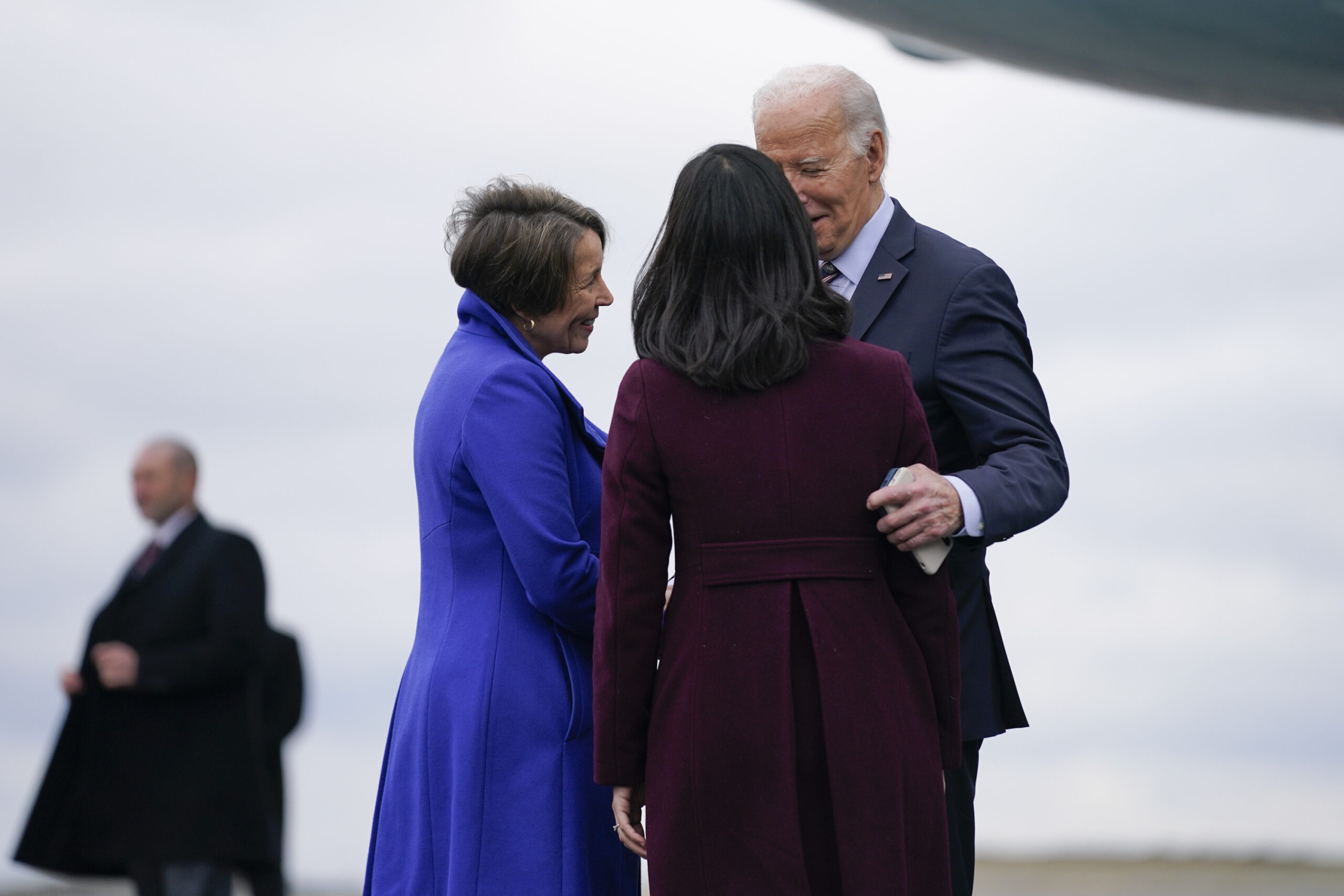 President Joe Biden is greeted by Massachusetts Gov. Maura Healey, left, and Boston Mayor Michelle Wu as he arrives at Boston Logan International Airport to attend several campaign fundraisers, Tuesday, Dec. 5, 2023, in Boston. AP Photo/Evan Vucci.