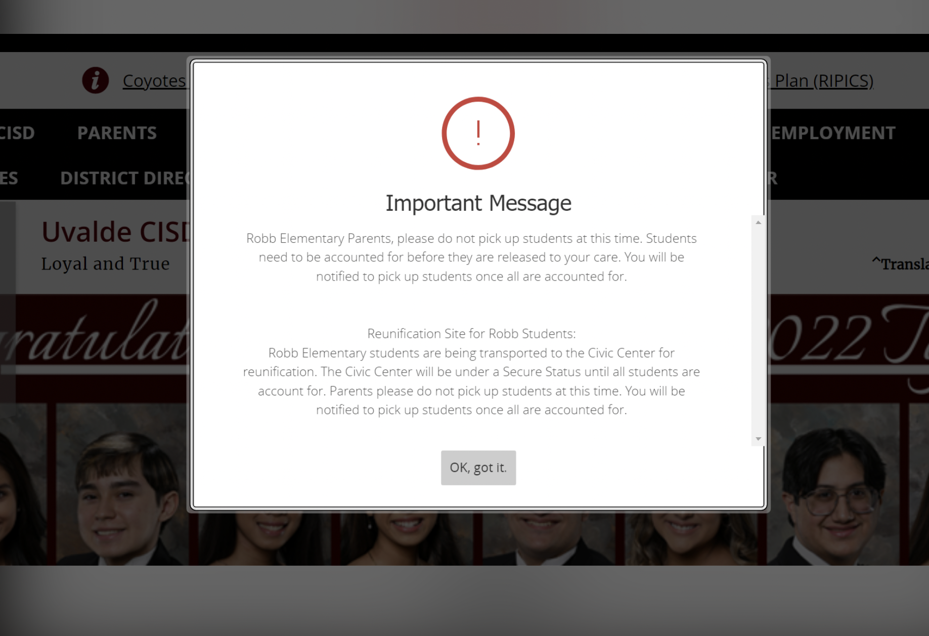 The district website asks parents not to show up to Robb Elementary School to pick up their children. Parents have been asked to come to the Uvalde Civic Center for reunification while students are accounted for.