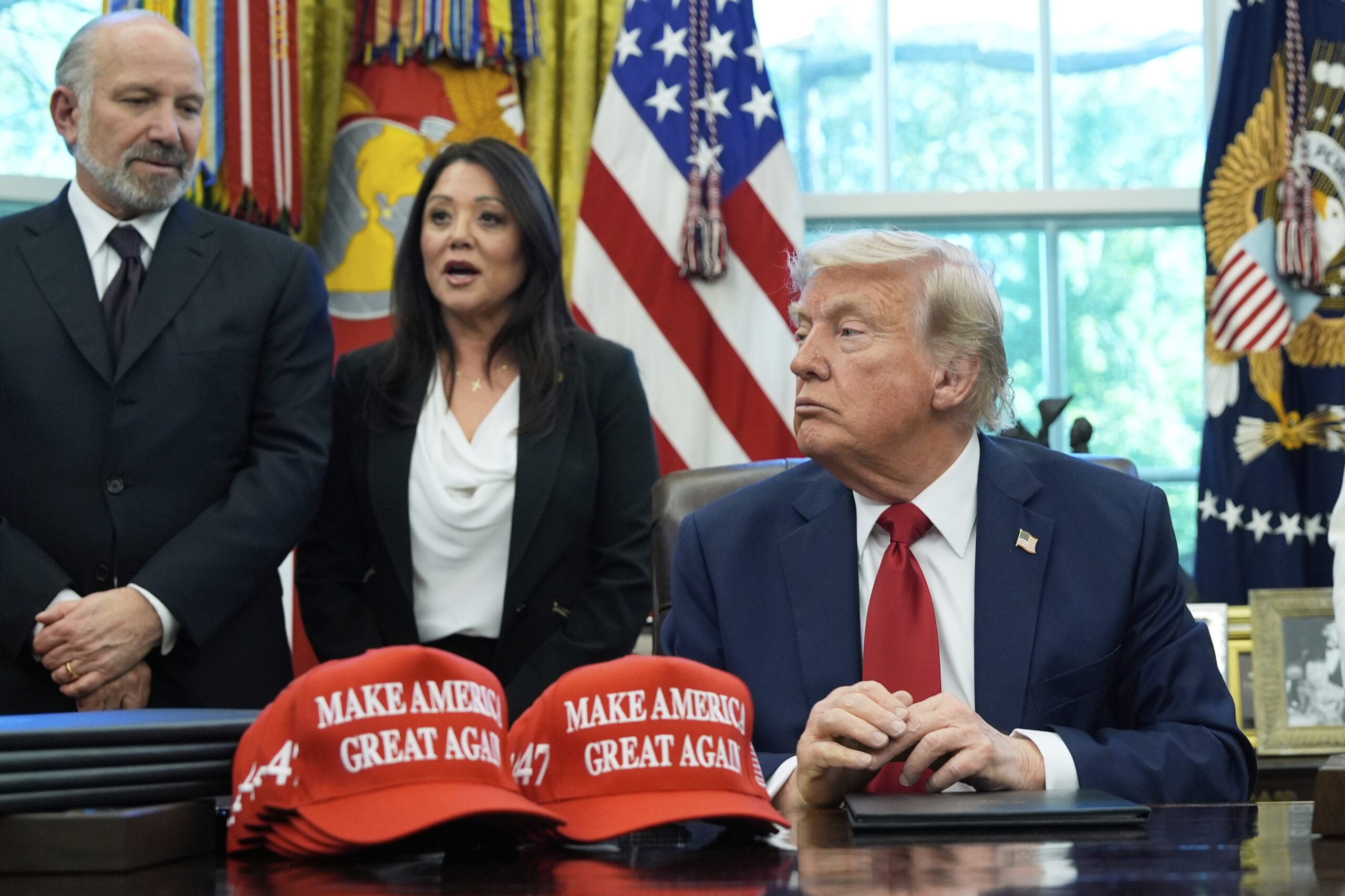 President Donald Trump listens as Labor Secretary Lori Chavez-DeRemer speaks as he signs an executive order in the Oval Office of the White House, Wednesday, April 23, 2025, in Washington, and as Commerce Secretary Howard Lutnick listens. (AP Photo/Alex Brandon)