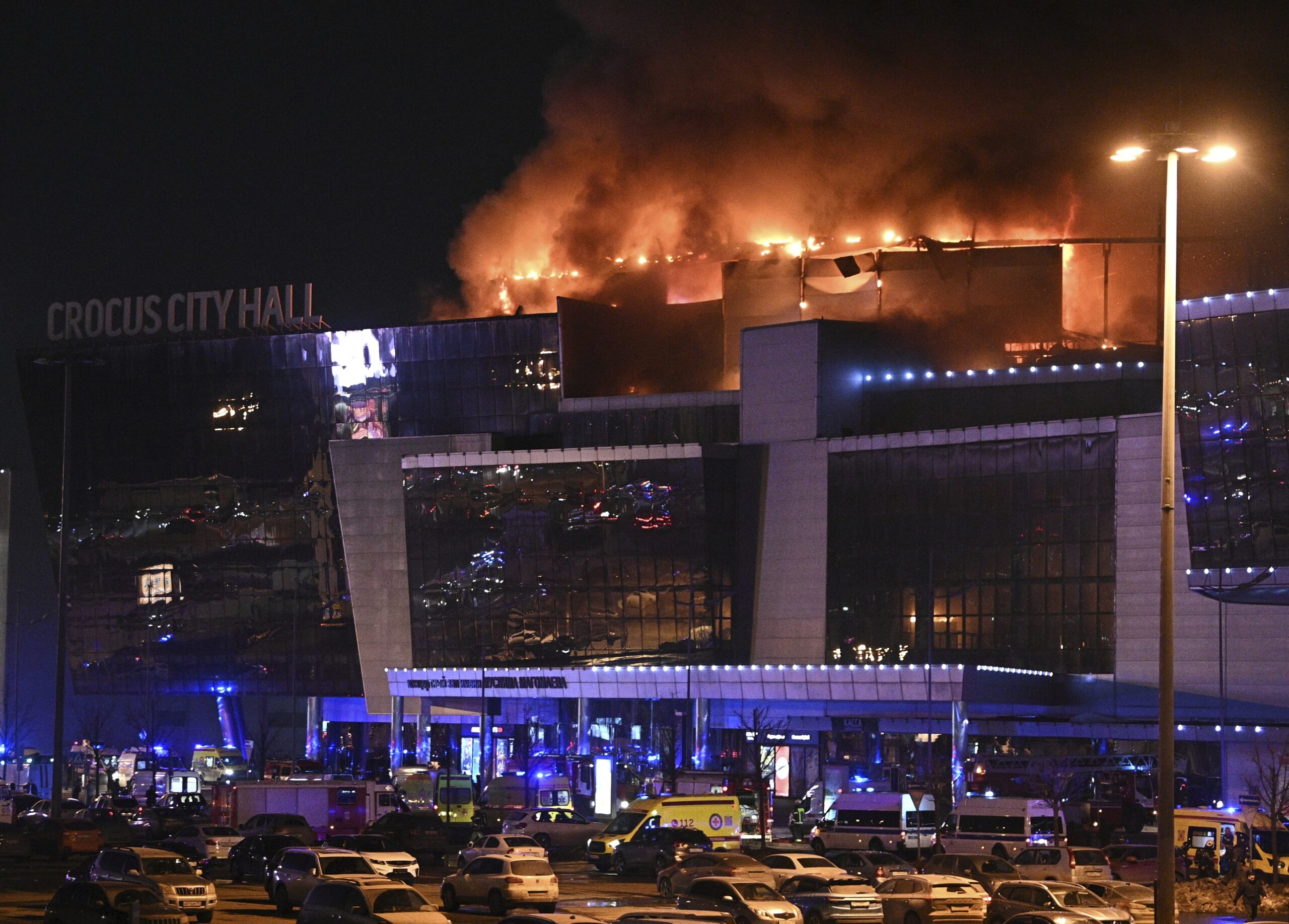 Smoke rises above the Crocus City Hall concert venue following a reported shooting incident, near Moscow, Russia. Several gunmen in combat fatigues burst into a concert hall on March 22 and fired automatic weapons at the crowd, injuring an unspecified number of people. Sergey Bobylev / Sputnik via AP