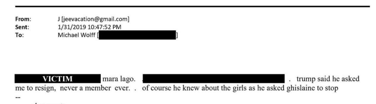 “[Victim] mara lago. [identifier]. Trump said he asked me to resign, never a member ever. Of course he knew about the girls as he asked ghislaine to stop”