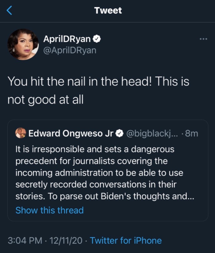 Responding to Ryan’s message, Motherboard reporter Edward Ongweso Jr. sarcastically wrote, “It is irresponsible and sets a dangerous precedent for journalists covering the incoming administration to be able to use secretly recorded conversations in their stories. To parse out Biden’s thoughts and anticipate his policy commitments, you must go through proper channels.”