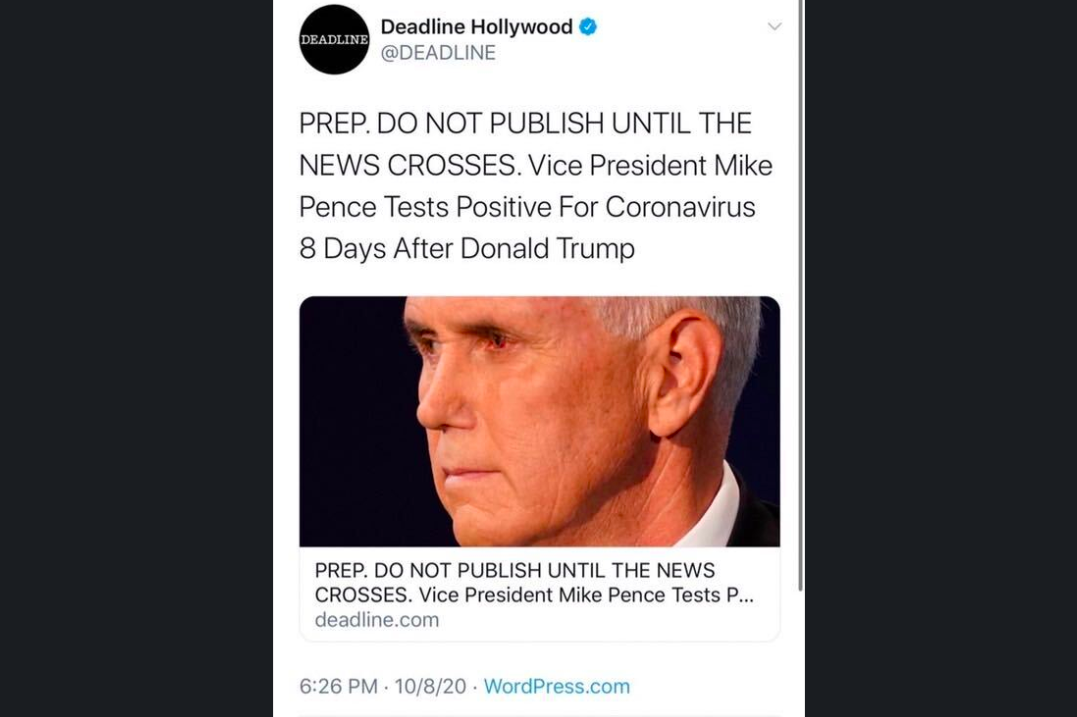 “PREP. DO NOT PUBLISH UNTIL THE NEWS CROSSES. Vice President Mike Pence Tests Positive For Coronavirus 8 Days After Donald Trump,” read the headline.