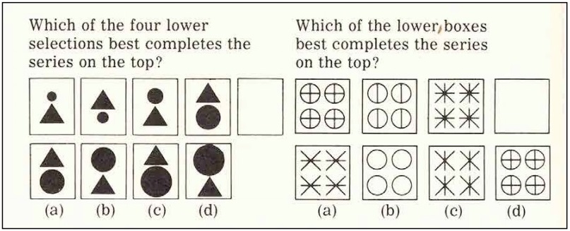 In some types of questions Koko did better than human counterparts of her age. At age four-and-one-half, she scored better than the average child of six in her ability to discriminate between same and different, and in her ability to detect flaws in a series of incomplete or distorted drawings. She astonished me with her ability to complete logical progressions like the Ravens Progressive Matrices test. Shown the following two problems from a similar test, she pointed to the correct answers (unknown to the tester) with almost no hesitation: