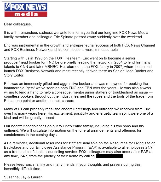 “It is with tremendous sadness we write to inform you that our longtime FOX News Media family member and colleague Eric Spinato passed away suddenly over the weekend,” the memo said. “Eric was instrumental in the growth and entrepreneurial success of both FOX News Channel and FOX Business Network and his contributions were immeasurable.”