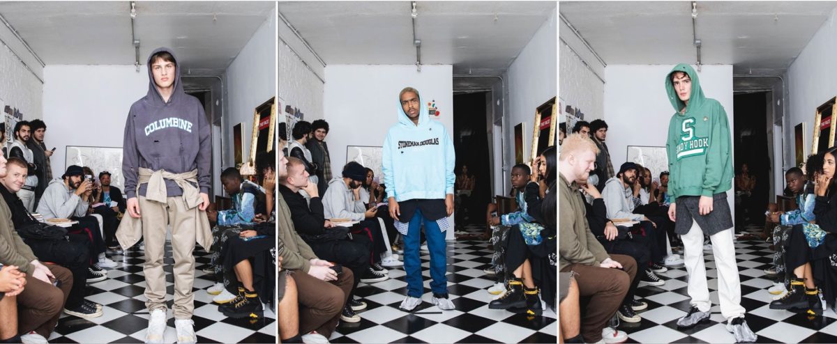The hoodies are designed to resemble school sweatshirts for “Columbine, Virginia Tech, Sandy Hook, and Stoneman Douglas” — all sites of infamous mass shootings — and feature simulated bullet holes.