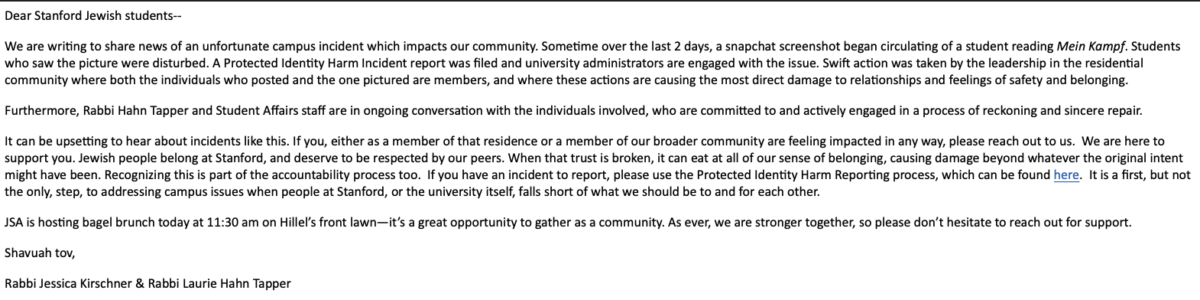 “Swift action was taken by the leadership in the residential community where both the individuals who posted and the one pictured are members, and where these actions are causing the most direct damage to relationships and feelings of safety and belonging,” wrote Hillel Stanford’s Rabbi Jessica Kirschner and Rabbi Laurie Hahn Tapper in an email message sent to Jewish students at Stanford. “It can be upsetting to hear about incidents like this…Jewish people belong at Stanford, and deserve to be respected by our peers.”