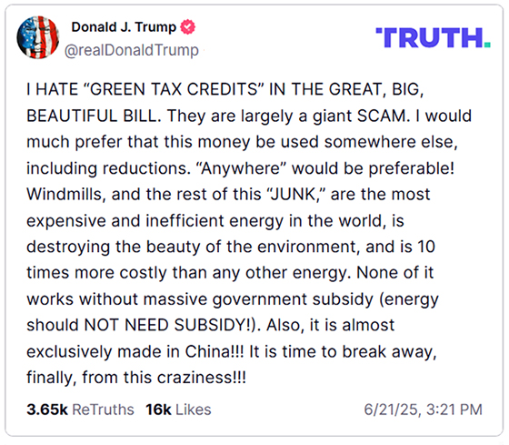 “I HATE ‘GREEN TAX CREDITS’ IN THE GREAT, BIG, BEAUTIFUL BILL,” he began. “They are largely a giant SCAM. I would much prefer that this money be used somewhere else, including reductions. ‘Anywhere’ would be preferable!”
