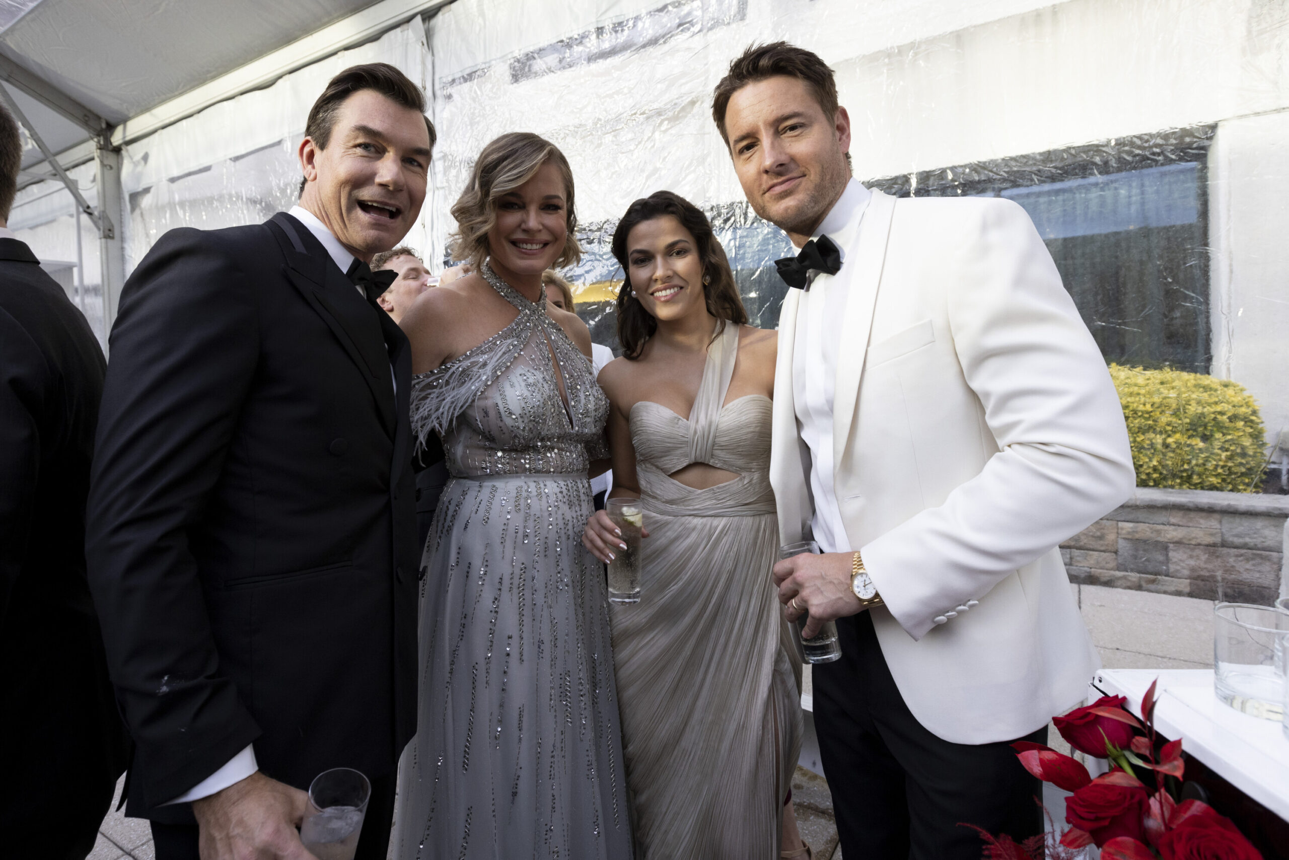Jerry O’Connell, Rebecca Romijn, Sofia Pernas, and Justin Hartley at the CBS News/POLITICO reception. Eman Mohammed/CBS.
