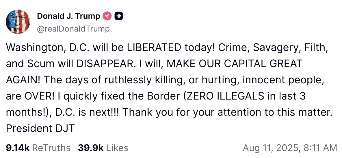 Moments earlier, Trump declared Monday as “Liberation Day in D.C.,” as he announced the rollout of “a historic action to rescue our nation’s capital from crime, bloodshed, bedlam, and squalor, and worse.”