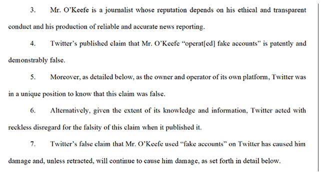 O’Keefe, in turn, said Twitter was defaming him with that explanation.